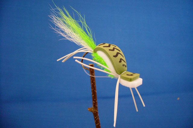 Sizes #4,#6.This is a high floating bug that will move a lot of water when stripped in with quick pulls on the fly line. the bigger size offers quite a mouthful to whatever spieces your after, so be prepared for anything! These are a little harder to cast because they catch a lot of air, but once you get aÿgood length ofÿline out it gets easier. Sometimes it's a good idea to let the bass bug sit still for a few moments after it hits the water before starting the retrieve. Often, it's that first quick pull that gets the strike. The best retrieve is a quick pull, hold, quick pull, hold method.